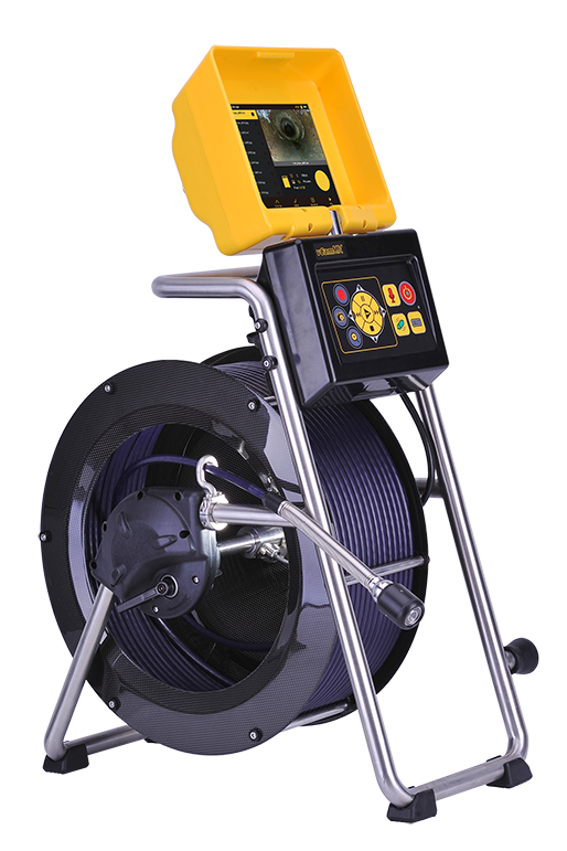 The vCamMX reels are made of stainless steel tubular construction with a lightweight rugged carbon fiber pushrod drum. The multi angle LCD and frame which can be used in a upright or horizontal position is usable in tight confined space use, entering vents from rooftops stores easily in most utility vehicle compartments. The pushrod is traceable with the use of a utility locater transmitter and comes with a dual frequency built-in locatable sonde.